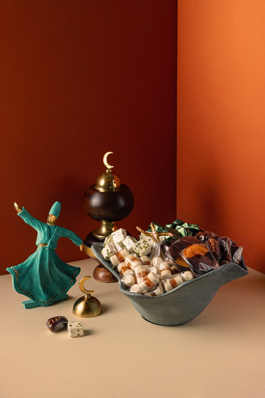 Assorted chocolate with malban in a green ceramic vessel